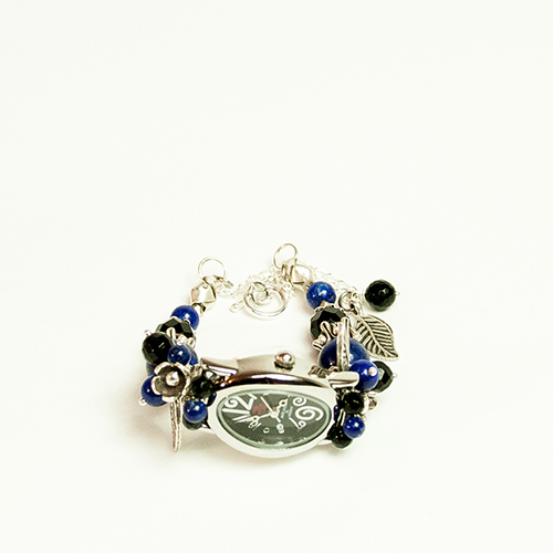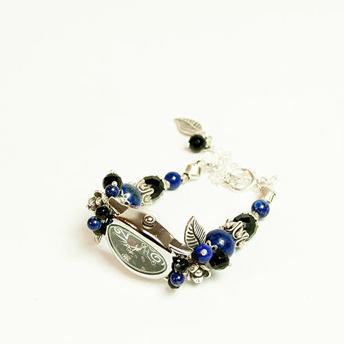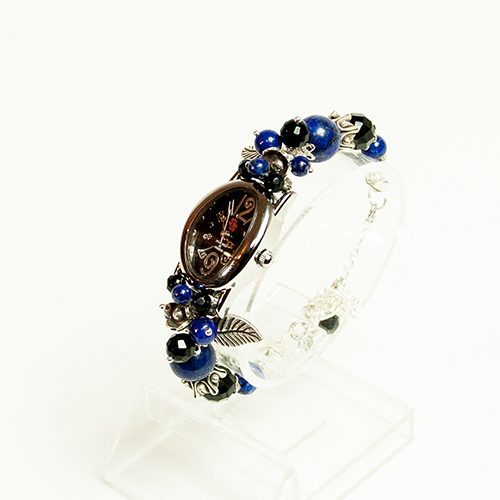 シルバーのお花とラピスラズリ・オニキスが華やかに手首を飾るエレガントなブレスウオッチ。