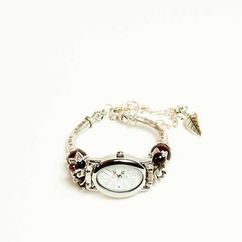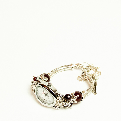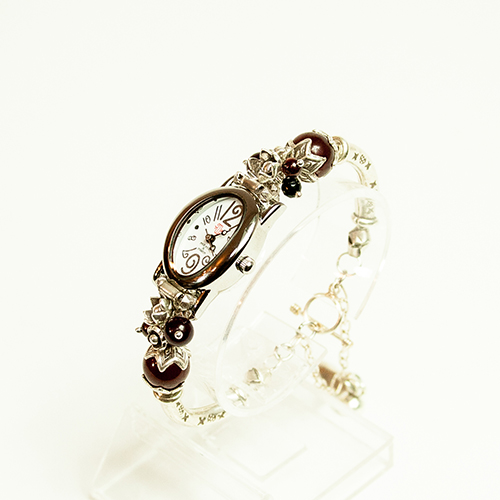シルバーのお花とレッドカルセドニー・オニキス・ガーネットが華やかに手首を飾るバングルタイプのブレスウオッチ。