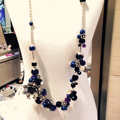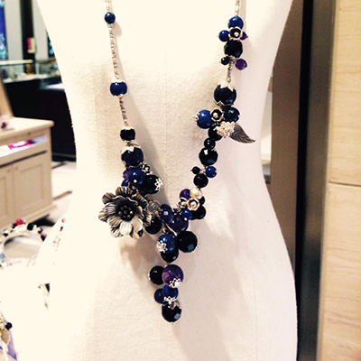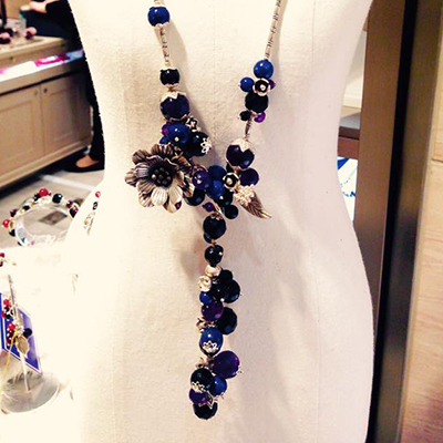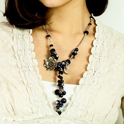 アネモネのモチーフが胸元を美しく飾るブルーカラーのロングラリエットです。