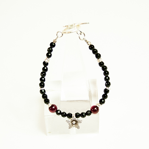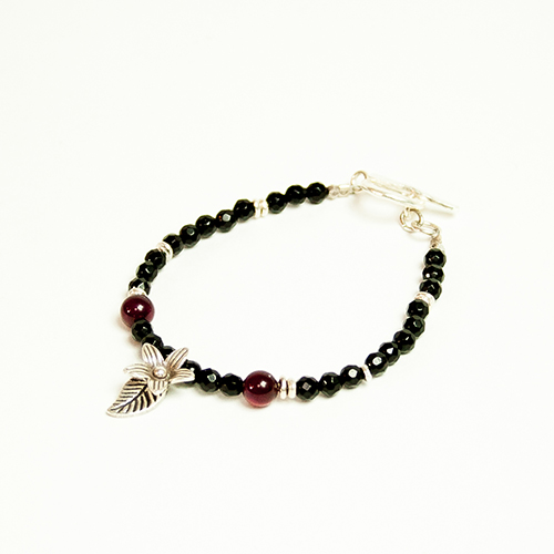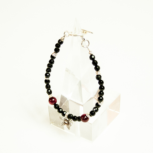 オニキスベースにシルバーのシャープなお花のモチーフとハードなマンテルにレッドカルセドニーがアクセントのメンズの方でも使えるシンプルなブレスレット。