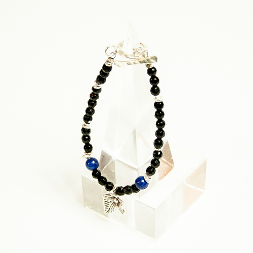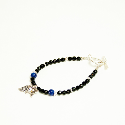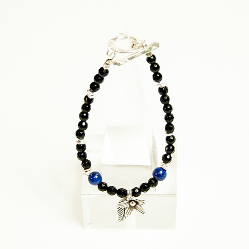 オニキスベースにシルバーのシャープなお花のモチーフとハードなマンテルにラピスラズリがアクセントのメンズの方でも使えるシンプルなブレスレット。