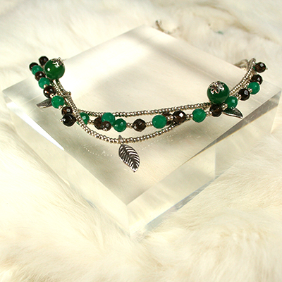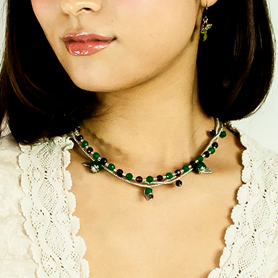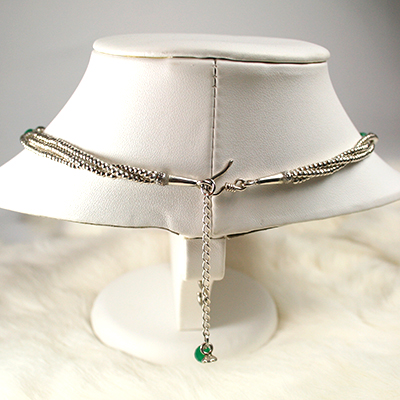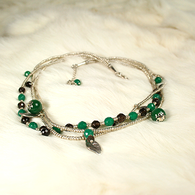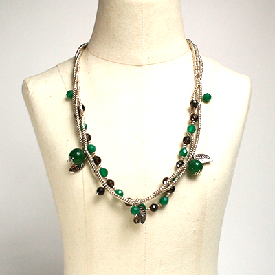 ツブシルバーとグリーンカルセドニー・スモーキークオーツの華やかな3連ラウンドネックレスです。