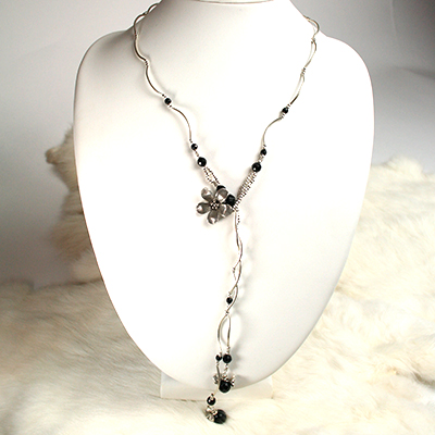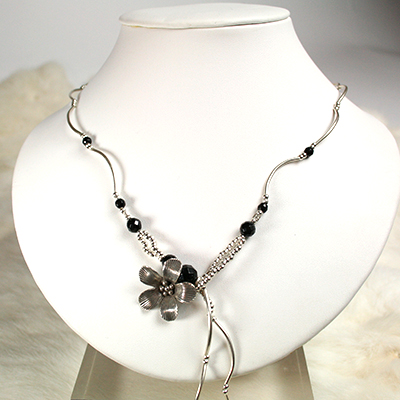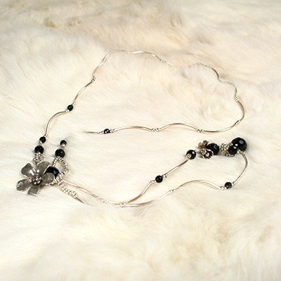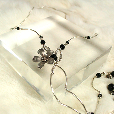 なみなみシルバーとハナミズキとオニキスが胸元で軽く揺れる愛らしく可愛いいラリエット